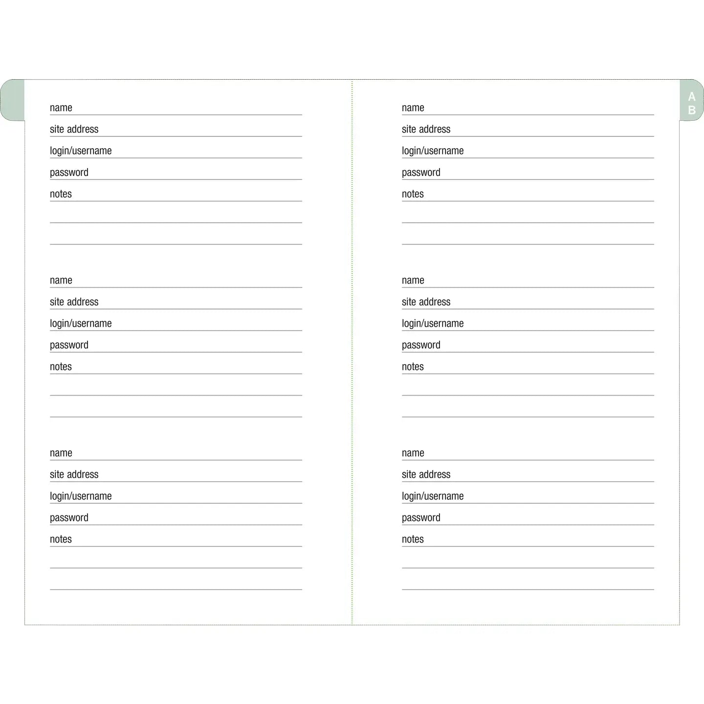 Tired of losing track of the websites you visit, along with their usernames and passwords? Now you can keep them all in one convenient place! This time- and headache-saving little volume is organized with tabbed A to Z pages, with space on each page to write down websites, usernames, passwords, and extra information. You'll also find pages in the back to make notes about home network configurations, software license numbers, etc. Removable cover band / label keeps logbook discreet. Matching elastic closure keeps your place or keeps logbook closed.